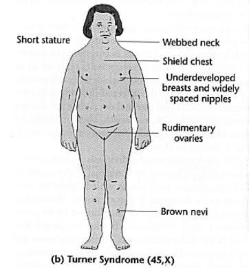 터너 증후군군 XX 또는 XY 의 형태로 정상적으로 존재해야 하는 성염색체가 X 단일 염색체 (45, X) 또는 X 부분 단일 염색체로 변경되어 발생하는 질환이다.